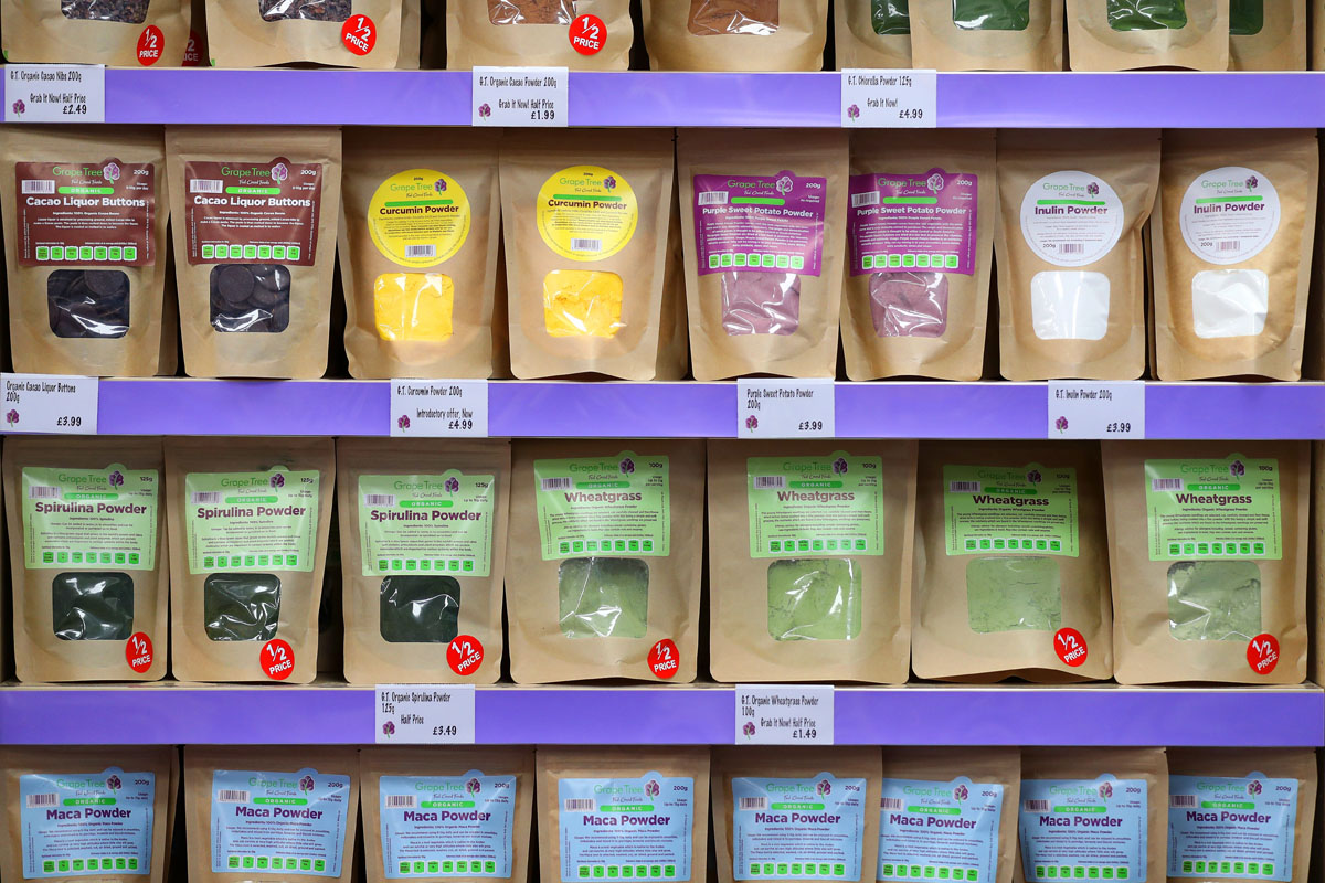 Grape Tree stocks a huge range of whole foods including dried fruits, nuts & seeds as well as home baking products, spices, “old-fashioned” sweets and confectionery.